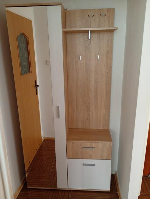 Nowoczesna, przestronna szafa ubraniowa w jasnym kolorze drewna. Posiada lustro o wymiarach 38 x 188 cm szafę na ubrania, ...